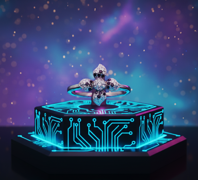 A hypnotic blend of dark sparkle and pure light — a ring that turns every glance into a moment.The Midnight Bloom Radiance Ring is designed to awaken the part of the mind that craves contrast, balance, and rare beauty. Its floral star silhouette features both deep midnight stones and bright shimmering crystals, creating a dual-sparkle effect proven to draw the eye more effectively than uniform gems.