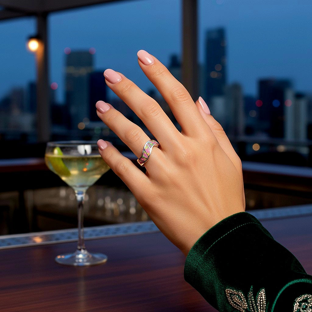 A hypnotic wave of color that glows with movement.This stunning 925 sterling silver band features a vibrant pink opal inlay designed in a flowing wave pattern that instantly catches the eye. Each section of opal flashes neon hues of pink, green, yellow, and electric iridescence — creating a living, shifting glow with every tilt of your hand.