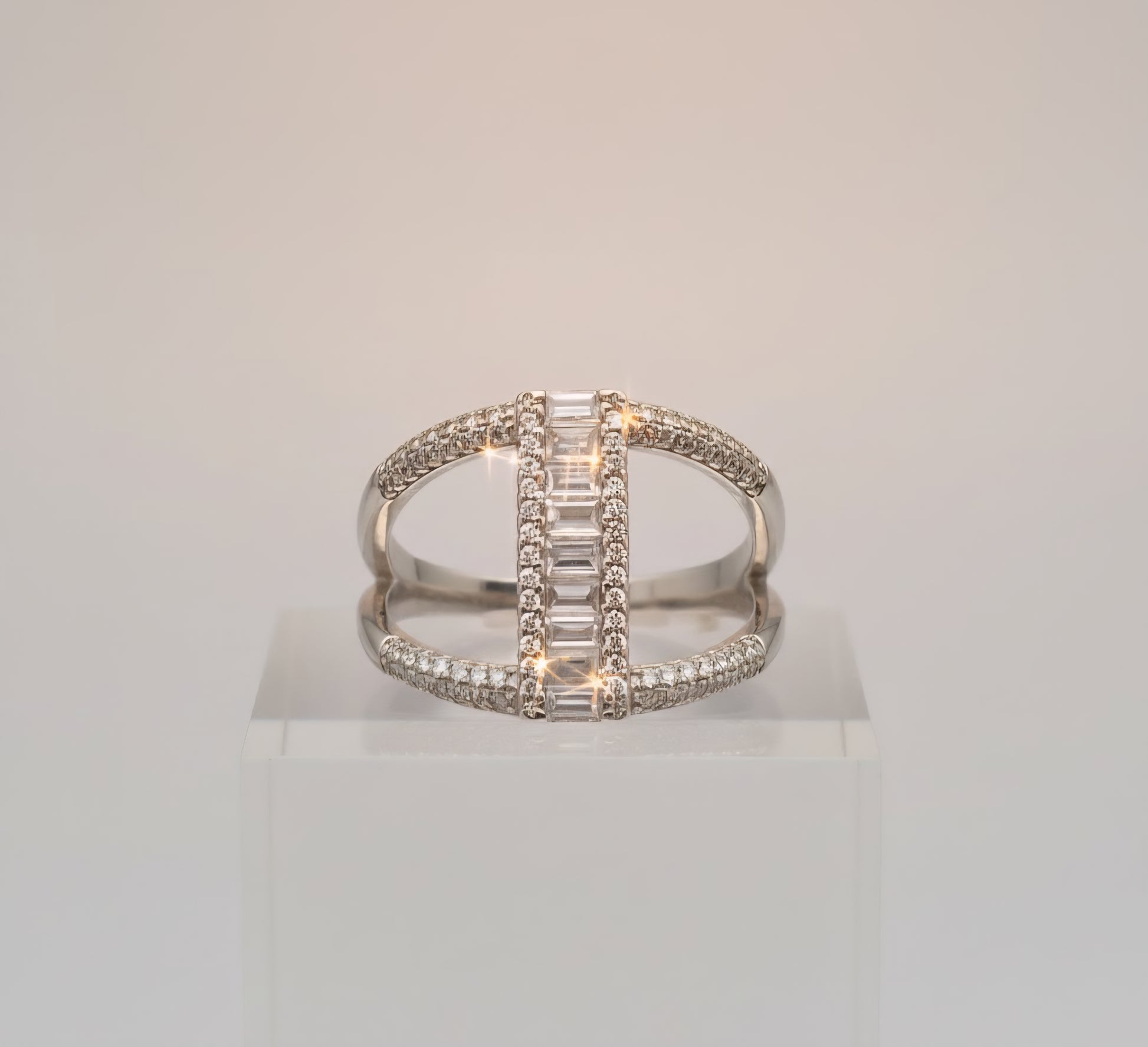Where modern architecture meets high-end sparkle.This breathtaking 925 sterling silver ring is a true statement of luxury. Designed with a bold double-band silhouette, it features a center column of radiant baguette-cut stones framed by pavé brilliance—creating a clean, elegant, modern sparkle that catches light from every angle.