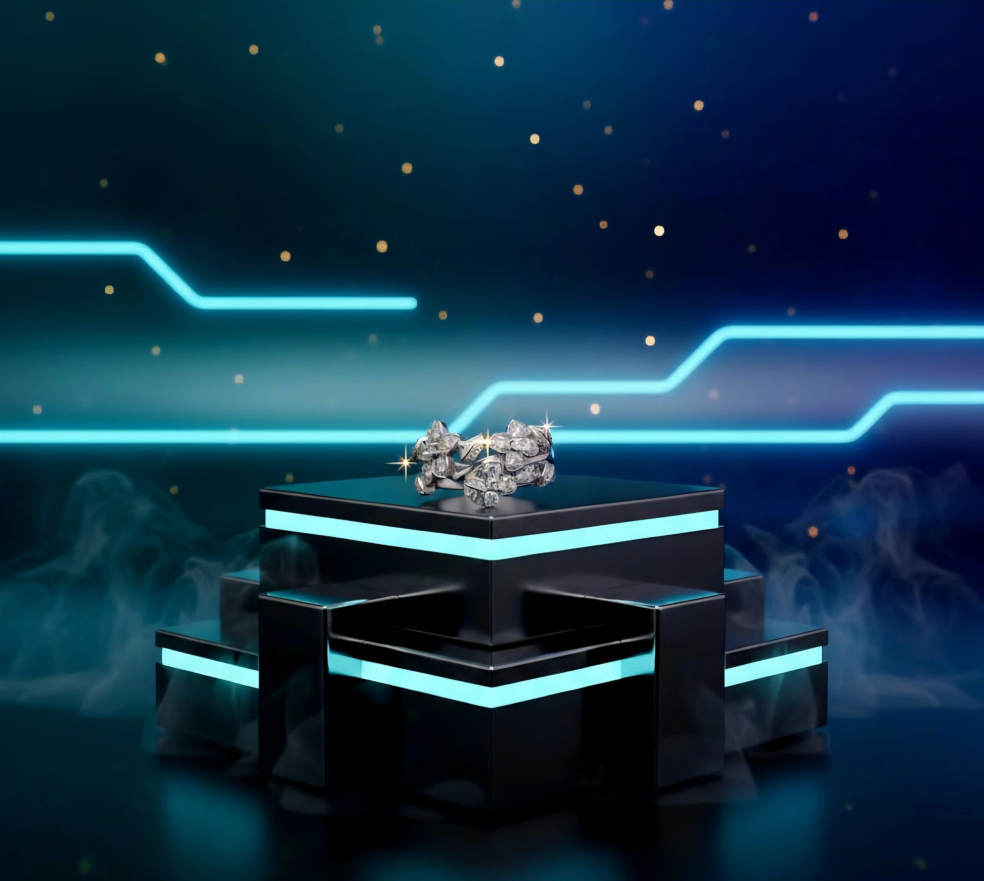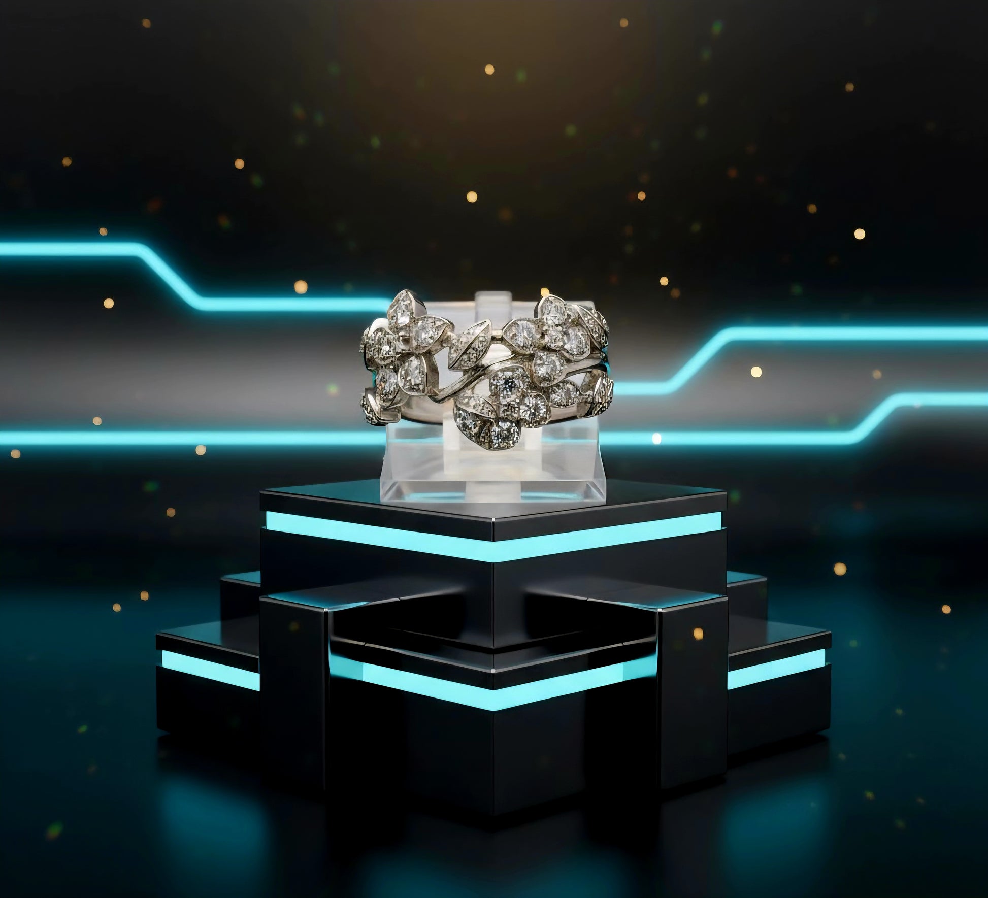 This piece is a miniature garden sculpted from pure brilliance. Each flower is built from clustered round stones, arranged to mimic petals bursting open. Between the blossoms, polished leaf-shaped details create a delicate vine effect that wraps naturally around the finger.