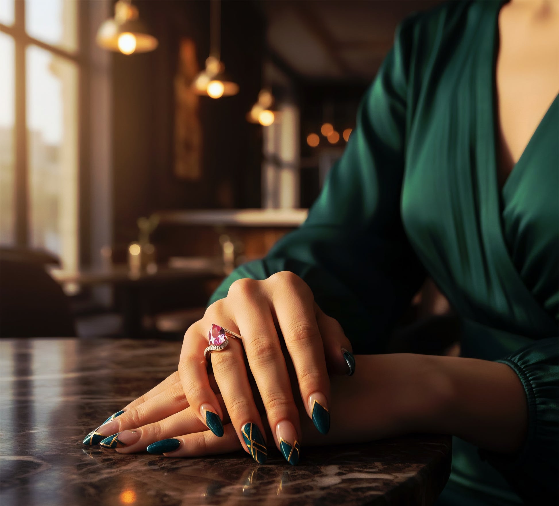 A spotlight-stealing pink glow that captures the heart instantly.This breathtaking ring is designed to stop time the moment it catches the light. Featuring a large pear-cut pink gemstone wrapped in a flowing, diamond-lined curve, it radiates elegance with a modern twist. The stone glows like captured sunrise — soft, romantic, and full of energy — while the asymmetrical band creates a luxurious high-end silhouette.